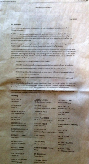 The nearby photo (apologies for the quality; it was quickly taken with my phone; inc.com didn’t do much better, but doesn’t connect the dots) is of a paid ad in the 12may17 WSJ containing an open letter to President Trump from the grim array of large corporation signatories beseeching him to keep the US in the recent Paris accords that presume to combat preventable manmade global warming. When we read the bulleted reasons for why it is in our interest to remain bound to those accords, it should become clear that these arguments are meant to convince and comfort the nation’s light thinkers. All of them are specious in the sense that they outline actions and business practices which the corporations could undertake on their own without any need for the Paris accords.