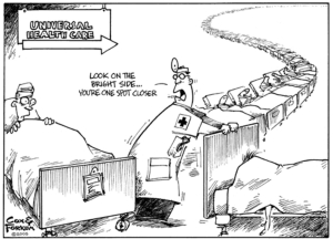 The bottom line of all this push toward a (horribly misnamed) “single payer system” (SSS) is that, for all the reasons known to thinking people everywhere, no country has a laudable and/or sustainable government run healthcare system. All of them are ragged bureaucracies, delivering already bad services for a very high price. And all of them are looking for ways to deliver even less at a higher cost in ways that are difficult to discover while you’re healthy, and that immediately obvious but too late to fix once you become a victim (aka ‘patient’).