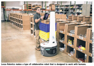 “The worker doesn’t have to look for the product, the robot tells them exactly where it is,” said Bruce Welty, chairman and co-founder of Locus Robotics Corp., which makes the robots. Once the order is complete, the robot carries it over to a packing table, then returns to the aisles with another assignment. Read that as ‘another assignment for the human’; and the human’s job? Act as the pair of grasping arms (manipulanda) to pick up a part from the shelf where and when the robot instructs him to do so.