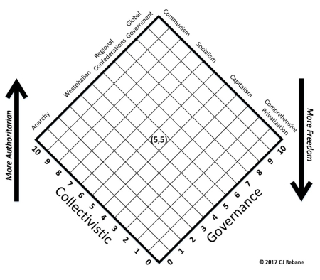 In the figure below we present a grid representing the two-dimensional space over a defined range of governance, and a range of collectivistic social orders.  The governance (G) range encompasses a continuum starting with anarchy at G = 0, and progressing all the way to one world global government at G = 10.  The collectivistic (C) range starts with comprehensive privatization at C = 0 where nothing is owned collectively – everything is private property to be disposed of as its owner wills.  At the other extreme of the collectivistic range is communism at C = 10 in which the collective owns everything and private property has disappeared.G-C chart