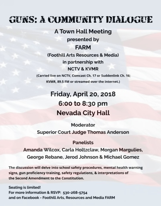 [21apr18 update] The town hall came off pretty much as advertised; attendance was almost at capacity in the Nevada City council chambers. However, the way that the discussion was framed for the panel was a bit different than my takeaway from the first meeting. Actually, the discussion was not framed at all save for asking us all to talk about guns and school safety โon the community levelโ.
