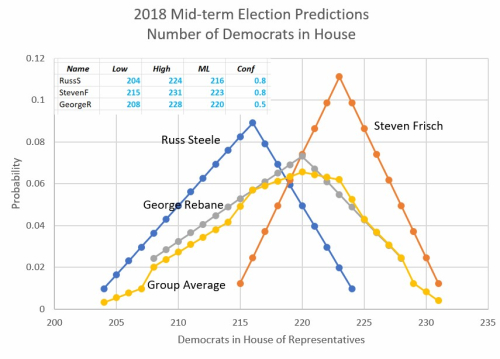 2018MABsMidterm Election MABs.  Only three of us cared to offer their MAB distributions for the outcome of the House elections.  I have computed the MABs shown in the upper left of the above figure, along with the plots of the discrete MAB probabilities for each outcome for the number of House Democrats who will be seated January 2019.  Recall, of the 435 seats a majority requires at least 218.  The figure shows the definite and confident party biases of Messrs Steele and Frisch, with Moi the Chickens#!t timidly sneaking in there with a 0.5 confidence for my most likely (ML) of 220 seats for the Dems.  It is clear that RussS will win with the best prediction if the Dems get less that 219 seats, and StevenF will win if the Dems get more than 219.  And 219 happens to be the ONLY number of Dems that will make me the winner – very sad.  However, if we consider the ‘wisdom of crowds’ as the shown group average, then I am the closest to the common mind in this little prediction derby.  Alas, this is a position of which I have never been a proud resident.  Oh well, we’ll see next Wednesday morning how it all shakes out.
