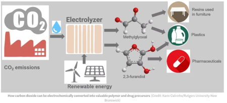 OK, so what’s the latest that real technology and science have to say about that dastardly GHG, yes, CO2. Well, as reported by New Atlas (here) it turns out that a team of scientists at Rutgers University have achieved an artificial photosynthesis breakthrough that promises to allow the manufacture of plastics, resins, and pharmaceuticals “on the cheap”. The overview of the process is shown in the figure, and the complete story is published in Energy & Environmental Science (Issue 9, 2018 here).