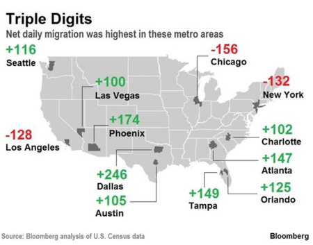 The exodus of the producers and the productive from California has been a recurring theme on RR ever since the Democrats assumed total control, turned the state into the nation’s home for welfare recipients, started raising taxes and fees as if there were no tomorrow, and opened its gates to illegal aliens. Essentially, the Democratic super-majority has turned the state into a sanctuary from sanity. Among the reams of data presented to buttress the exodus argument, a reader sent me the graphic below that highlights just one aspect of nationwide migrations – and these are NET migrations – from/to our country’s prominent metropolitan areas (more here).