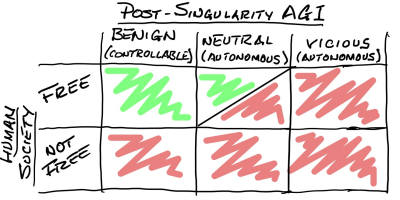 Possible FuturesThe three columns indicate the kind of AGI (Artificial General Intelligence) that the Singularity will produce.  The benign kind will be controllable and will be able to help its human masters achieve the things that it is commanded to achieve, whether those be new medicines or designs of starships or devastating weapons.  The neutral AGI will be an autonomous being that seeks to maximize its own utility within unknown behavioral constraints using whatever resources it can command.  It will look at humanity simply as another entity in its environment and possibly in its spectrum of available resources.  The last kind is an autonomous and unconstrained AGI whose utility maximization requires the removal of human life from earth.