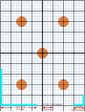 Now, with these preliminaries out of the way, we can start the scoping procedure. Place your target at 100 yards, and set up your rifle in the sled so that it’s easy to put your crosshairs or ‘point of aim’ (POA) anywhere on a letter size (8.5×11) target sheet. It is best if the target is made specifically for scoping a rifle. Since I haven’t been able to find the exact design that I consider to be most helpful in this task, I designed one myself which is shown below, and the PDF of which you can Download Target_1inGridannotated . Just be sure when you make copies, that the one inch squares remain one inch squares.