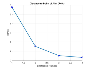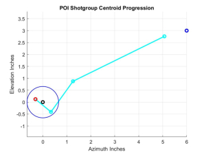 Just a word of background in the development of this new and improved method to quickly get into the CEP with the minimum number of rounds expended. I asked myself if there were a better way than chasing the centroid with 3-round shotgroups. To answer that, I wrote a simulation program (natch!) that did the proper sampling of the probability distributions and actually computed the centroids of N-round shotgroups repeated M times to see how the distance to bullseye behaved starting from arbitrary distances from the bullseye. I programmed the graphics to illustrate a number of the outputs, two of which I illustrate here below. The first is a plot of an actual (‘Monte Carlo’) trial of the centroid to POA (bullseye) distance for each succeeding shotgroup. The second is the actual location of the centroids as they approach the bullseye located at (0,0) as indicated by the little black circle and surrounded by the blue CEP circle described above. The little blue circle at (6,3) inches was the arbitrary starting point, before adjustments, marking the centroid of POIs if we fired a bunch of rounds with the POA being the bullseye – i.e. the little blue circle marks the starting off-distance between the rifle’s bore and scope’s crosshairs.