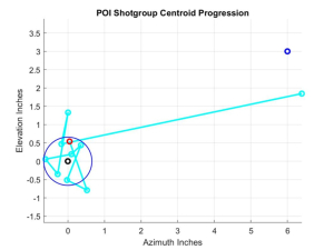 With your centroid marked, you can just read off the x and y distances from your POA bullseye and translate those inches into A and E clicks. Remember, you are chasing the centroid out from the bullseye. So if your centroid was 3 inches to the right of the bullseye center, and 2.5 inches above the bullseye, then with 4 clicks/inch you’d dial in 12 A-clicks to the right, and 10 E-clicks up. When your centroid calculates into the orange, you’re done. However, most shooters will want to fire a confirmation shotgroup, if for nothing else than just to feel good about their work. Here you might run into a bit of consternation if your confirmation centroid falls outside the orange bullseye. What to do? Should you again reach for the A and E knobs? No, don’t do it because what you witnessed was the luck of a random draw from the Rayleigh distribution. Leave it as is, and fire another shotgroup if it’ll make you feel better. That centroid should be back in the bullseye. But there’s a better strategy here that will almost guarantee that once you’re in the CEP, you’ll not drift out of it on you next shotgroup. I’ll describe that directly.