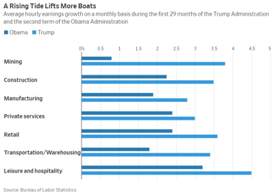It’s instructive to take a look at the magnitude of this particular stream of lies from the Left that started back in Obama’s time when we were assured that a max of 2% annual growth was going to be “the new normal”. And, of course, Team Obama demonstrated that dictum over his tenure which averaged growth under 2%. These people pulled every trick in the book to stifle the economy and keep workers’ wage growth essentially flat, all the while lying that they were helping the little guy and middle class. The little guys took it in the shorts also as the Dems boosted the minimum wage wherever possible so as to make the lower rungs of the economic ladder ever more inaccessible to our unskilled and youngest workers starting their careers.