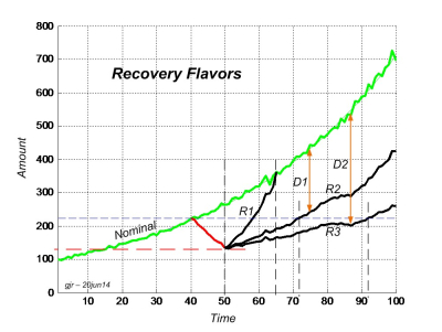 America’s economy has grown in a remarkably constant range of 3.3-3.4% annually from 1880 to 2008 on the eve of the Great Recession. To explain the different recovery flavors, I indicated such an exponential growth as the green line in the above graph taken from ‘The Recovery Rigamarole’. The arbitrary GDP amounts shown vary as a function of time, say, in years. At year 40 a recession/depression occurs that takes the GDP from around 225 down to 135 over a ten year period. At year 50 the economy begins to recover. But from there several ‘recovery’ paths are possible, three of which (R1, R2, R3) are shown. At this point it’s important to keep in mind that if the economy’s dip (red line) did not occur, then it would have continued growing at its long term (green line) rate – e.g. at year 50 it would have been about 265.
