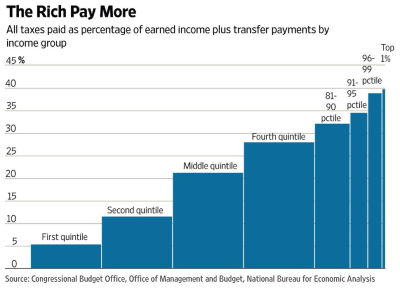 Economists Phil Gramm and John Early present the supportive data in their ‘Wealthy Americans Already Pay Their Share’. The accompanying graphic shows how much the different earning groups pay as a function of their earned income and received transfer payments.