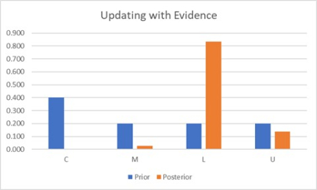 P(C|E) = L(E|C)*P(C)/(L(E|C)*P(C) + L(E|M)*P(M) + L(E|L)*P(L) + L(E|U)*P(U))