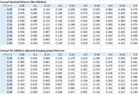 [Addendum]  Here’s a bit more quantitative stuff to give you an idea of how drastic the one-two punch of inflation and taxing unrealized returns will be.  The first table below shows the annual real returns on an investment that appreciates at a nominal annual rate of rI (top gray row) and which is taxed at rate rT (lefthand gray column) in an inflation-free economy.  So, if your investment returns 10% that is taxed at 25%, then your actual nominal return is 7.5%.