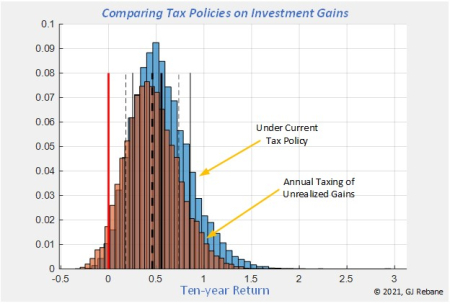 The orange histogram shows the distribution of returns when annual gains are taxed yearly.  The 10-year return in this case is 45% (heavy dotted line), with a standard deviation (thin dotted lines) of 28%.  The annual taxing of unrealized returns has reduced the 10-year return by 18% from its once-taxed current policy.  And we all know in what pockets this missing 18% winds up.