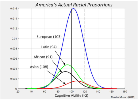 The long-taught but erroneous common wisdom is that cognitive capabilities are equally distributed across races. Using census data Murray presents his analysis of our four main racial groups and percentages making up our 330M population. Murray labels these European (60%), Latin (17.9%), African (12.8%), Asian (5.7%), Other (3.6%). Volumes of data over the years demonstrate that in the aggregate these groups have measurably different distributions of closely correlating scores in IQ, SAT, ACT, and other skill-based tests which have been meticulously controlled to eliminate the usual sources of non-racial bias. To illustrate this broad-based reality, Murray presents the proxy IQ distributions which are annotated in the nearby figure.