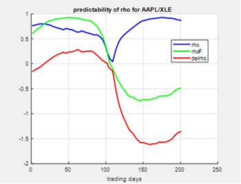 Finally, to drive home the point of this expose, we take a look at the predictability of rho over a short 200 trading day window (here from trading 600 to 800). The figure below shows in blue the behavior of rho, calculated from the last 125 trading days, in that interval. Similarly, in green we see rhoF, the actual future value of rho calculated over the next 125 trading days. The difference between the two is shown in red, and ideally we would like to see this line hover around zero, indicating that our calculated rho would serve well to predict its future value. However, the red trace shows that blatantly this is not the case, substantiating our thesis that using past time series to predict the correlation behavior of two stocks ranges from pretty much useless to possibly harmful to your portfolio’s performance.