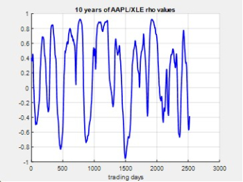 If you’re still with me, you get to look at some pretty pictures of how rho and beta misbehave. I downloaded about ten years of closing price data for the SP500, AAPL (Apple), EOS (high yield income ETF), and XLE (ETF of energy stocks). Then I wrote some code that allowed me to compute the rhos and betas from selectable past time windows, and also compare these over future time horizons. A sample of the outputs are presented for your edification and enjoyment.