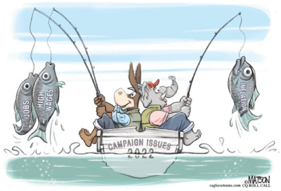 Now no one has claimed that Matson’s elevator makes it to the top floor. But lately during Bumblebrain’s administration, there’s reason to think that his elevator cable has snapped, or he joined the leftwing media lackies who believe, with some evidence, that their audiences compete at a disadvantage with doorknobs. Pilfered from the op-ed pages of the 28jan22 Union, his cartoon attempts to convince people that the Dems have two killer issues for the 2022 election while the Repubs have but one. Anyone who’s been awake in recent weeks knows that middle and lower class wages have lost buying power during the last year, and the jobs situation is bleak with workers on generous government doles unwilling to even attempt going back to work. On the other hand, the Dems’ Biden/Pelosi/Schumer hat trick has provided the Repubs with more issues than even Matson could fit into his sorry attempt to bamboozle voters.