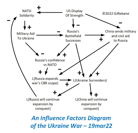 The ongoing Ukraine war is a complex affair with many dynamic factors that influence events and the state (attitudes/assessments) of the involved parties. These pages are home to a lively discussion and debate about the goings on in Ukraine and their worldwide impact. I’ve made an attempt to simplify and explicate my take on how the whole mish-mash comes together from what is known, claimed, and propagandized today. This assessment is reduced into an influence factors diagram shown below.