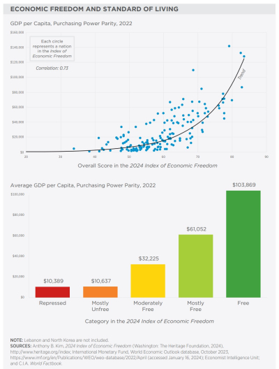 The Heritage Foundation published its 2024 edition of its Index of Economic Freedom (here) for all the countries of the world. Thanks to Bidenomics the US continues to drop in the prestigious ratings to its historically lowest place. And the alert reader is already aware of California’s rank in the various freedoms being in the toilet among the states as recently reported in Catoโs โFreedom in the 50 Statesโ (here).