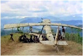 A similar culture-induced reality was enjoyed by tribes on a neighboring island during the Pacific campaign of WW2. The island had an airstrip for receiving cargo laden C-47 military transport aircraft. To the natives these giant aircraft were bringers of never-before-seen wondrous things to enrich and expand their lives. Not familiar with manufacturing processes, they believed “that the manufactured goods of the non-native culture had been created by spiritual means.” And no matter how many times it was explained and demonstrated to them, they never saw the airplanes as mechanical things operated by humans – to them they were simply alive as large flying creatures. When the war moved on and the airstrip was abandoned, the natives were bereft – the wondrous creatures stopped coming. Their response was simple, they formed what became known as a ‘Cargo Cult’ whose members continued to maintain the landing strip, and built decoys in the shape of airplanes to attract more of these giant flying critters full of presents. The clear and demonstrated reality of the foreigners did nothing to change their culture-rooted alternate reality. (more here)