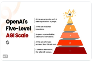 OpenAI, the company that has produced ChatGPT, GPT 3, and GPT-4 (here), has defined 5 levels to track their progress towards Artificial General Intelligence (AGI):
