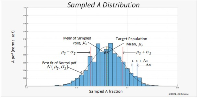 A poll result can be viewed as drawing a random variable RV from its probability distribution. If you could repeat the poll a large number of times the result of, say, the percentage preferring A can be displayed as a histogram shown below in Figure 1. Were we to repeat it again a gazillion times, we would get a slightly different shaped histogram. But all such histograms from a target population would have average (mean) values bunched around A%, the actual share of the target population that prefers A. And all of the histograms could be summarized by a familiar bell curve distribution with the sample mean μS, and standard deviation σS as shown.