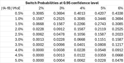 Examining the table’s PAB values, we see that when the reported |A% – B%| = |fA – fB| is very small, say 0.5%, then PAB increases from 0.3085 to 0.4338 with increasing MoE values. This range of large switch probabilities will advise the reader to accept the poll’s result with some considerable caution. However, when the report has higher separation values for the two preferences, then the switch probabilities are smaller and can be pretty much negligible over the shown range of MoEs. For |fA – fB| = 5.0% we have PAB max out at 0.0478 for MoE = 6%.