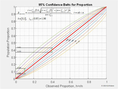 To use the banana curves of Figure 2 we can look at a couple of examples. Suppose a poll with a 1,000 respondent sample reports A% = 40%, the observed proportion on the x-axis. From the figure we determine the lower bound for 0.95 confidence interval for a 1,000 sample size is 0.370 on the y-axis which displays the actual population proportions fA. The upper bound is obtained from the upper 1,000 sample banana curve at 0.431. From this we know that the real share preferring A in the target (sampled) population lies between 0.370 and 0.431 with 95% probability. A similar examination is carried out for A% = 10% calculated from a 250 sample size that gives the confidence interval between 0.069 and 0.143.