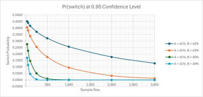 In Figure 3 we examine the impact of sample sizes directly on PAB. The four curves presented represent |fA – fB| values ranging from 1% to 8% in the vicinity of 0.45 preference shares.